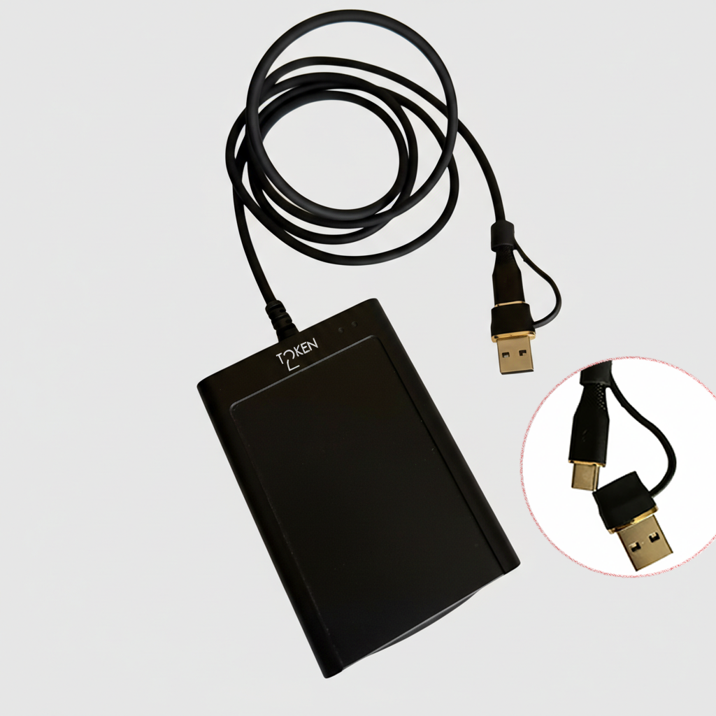 Token2 NFC Dual Reader is a dual-interface smart card reader designed for secure authentication, identity verification, and NFC applications. It supports both contact and contactless smart cards and is suitable for finance, e-government, telecommunications, network security, and other high-security environments.