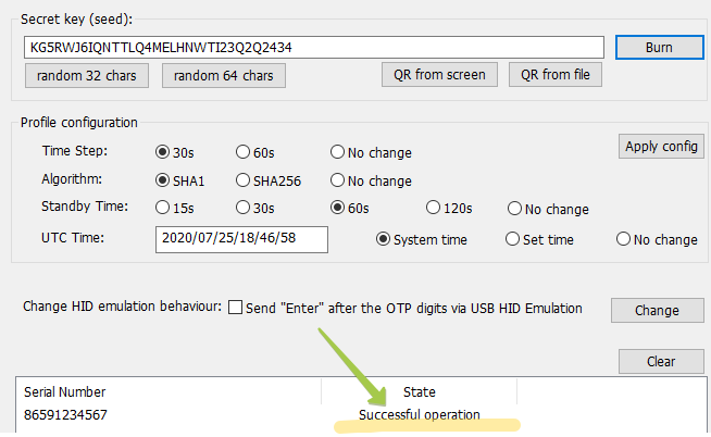 Enter the seed (in base32 format) or click on "random 32/64 chars" buttons to generate a random seed. If you need to read the seed from a TOTP QR image, click on 'QR from screen' to use a QR code currently on the screen (the USB Config app will minimize when taking a screenshot) or 'QR from file' to read from an image file.