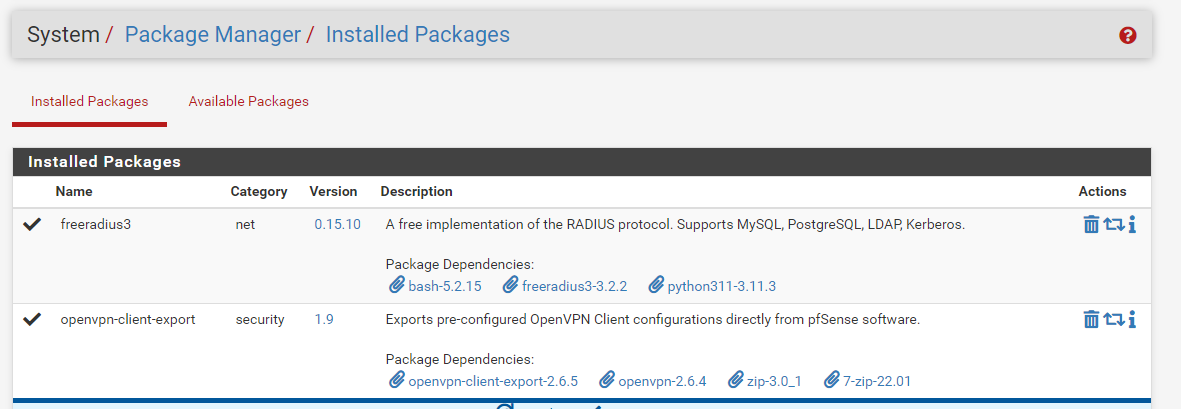 After successful installation, you will see the freeradius3 package in System/Package Manager/Installed Packages.